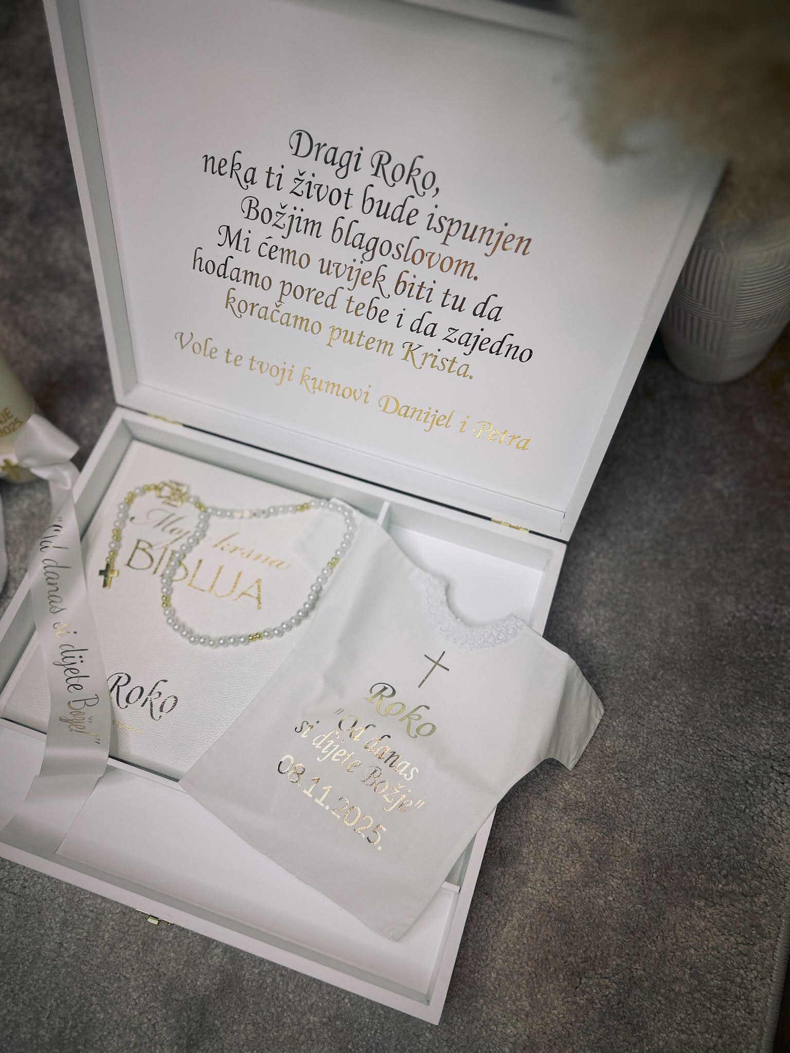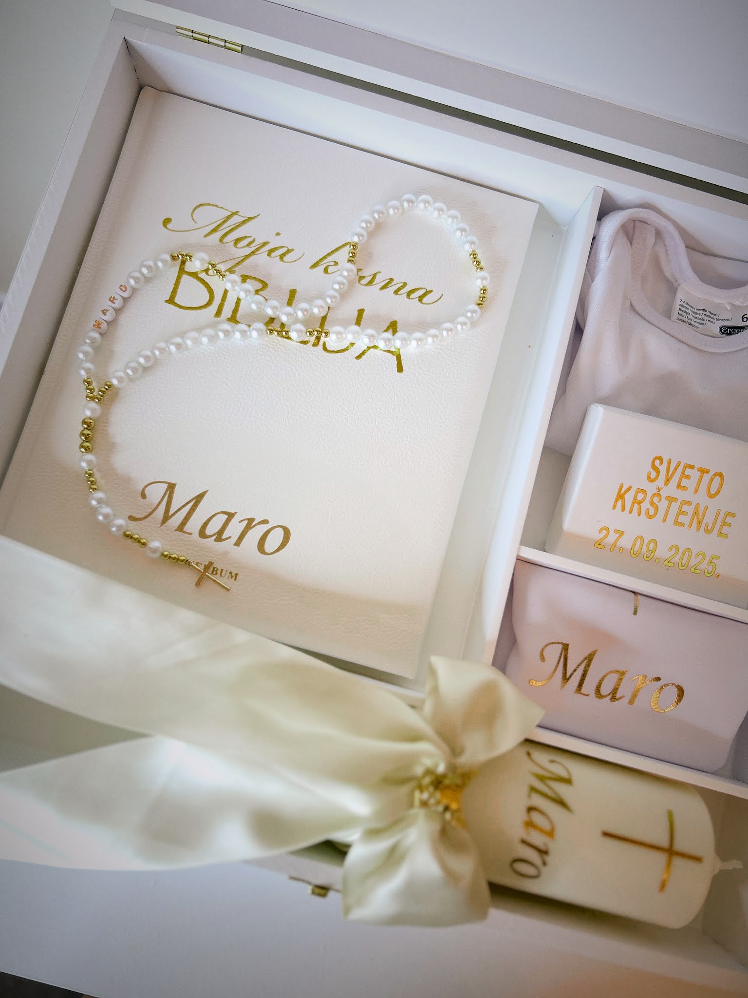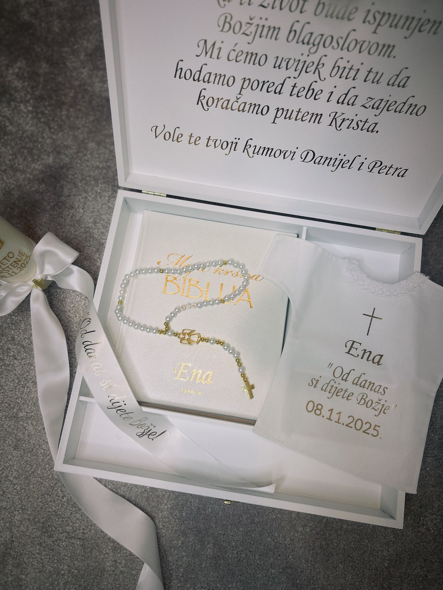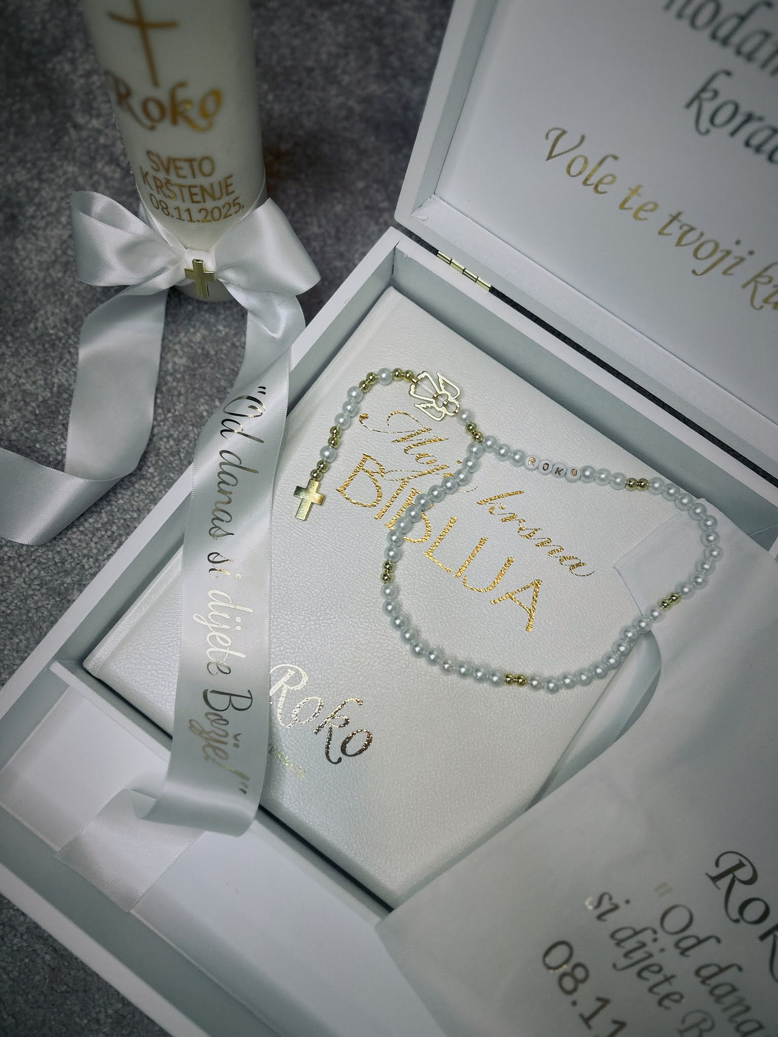 - Drvena personalizirana kutija, Biblija, svijeća, krunica, cipelice.