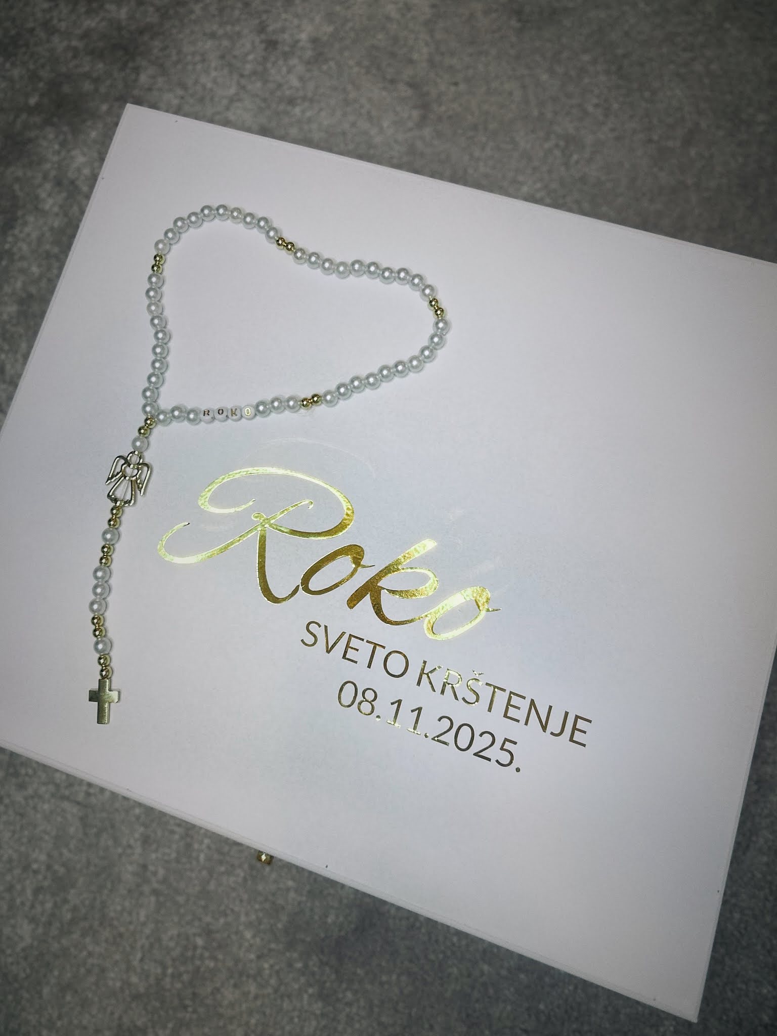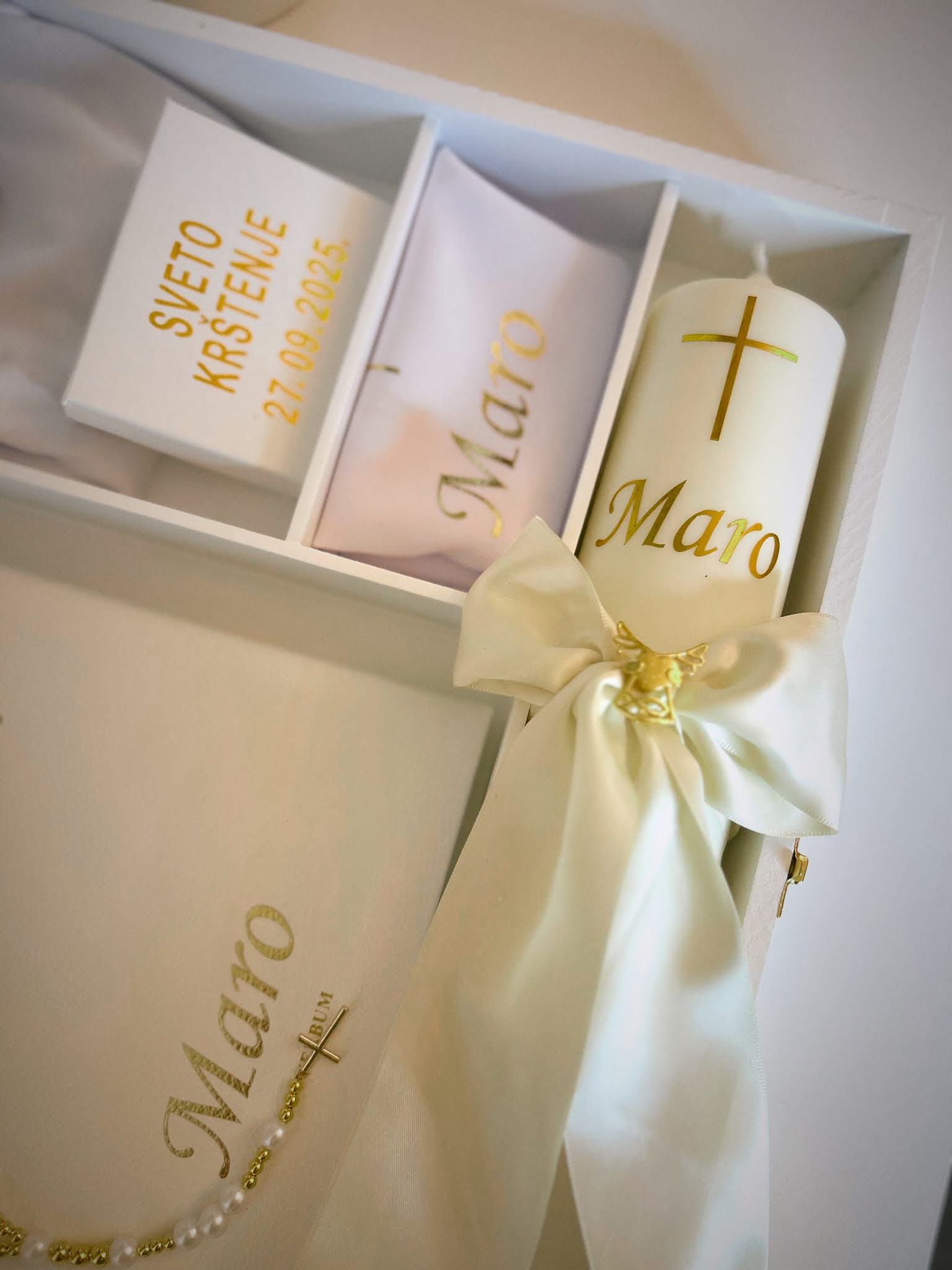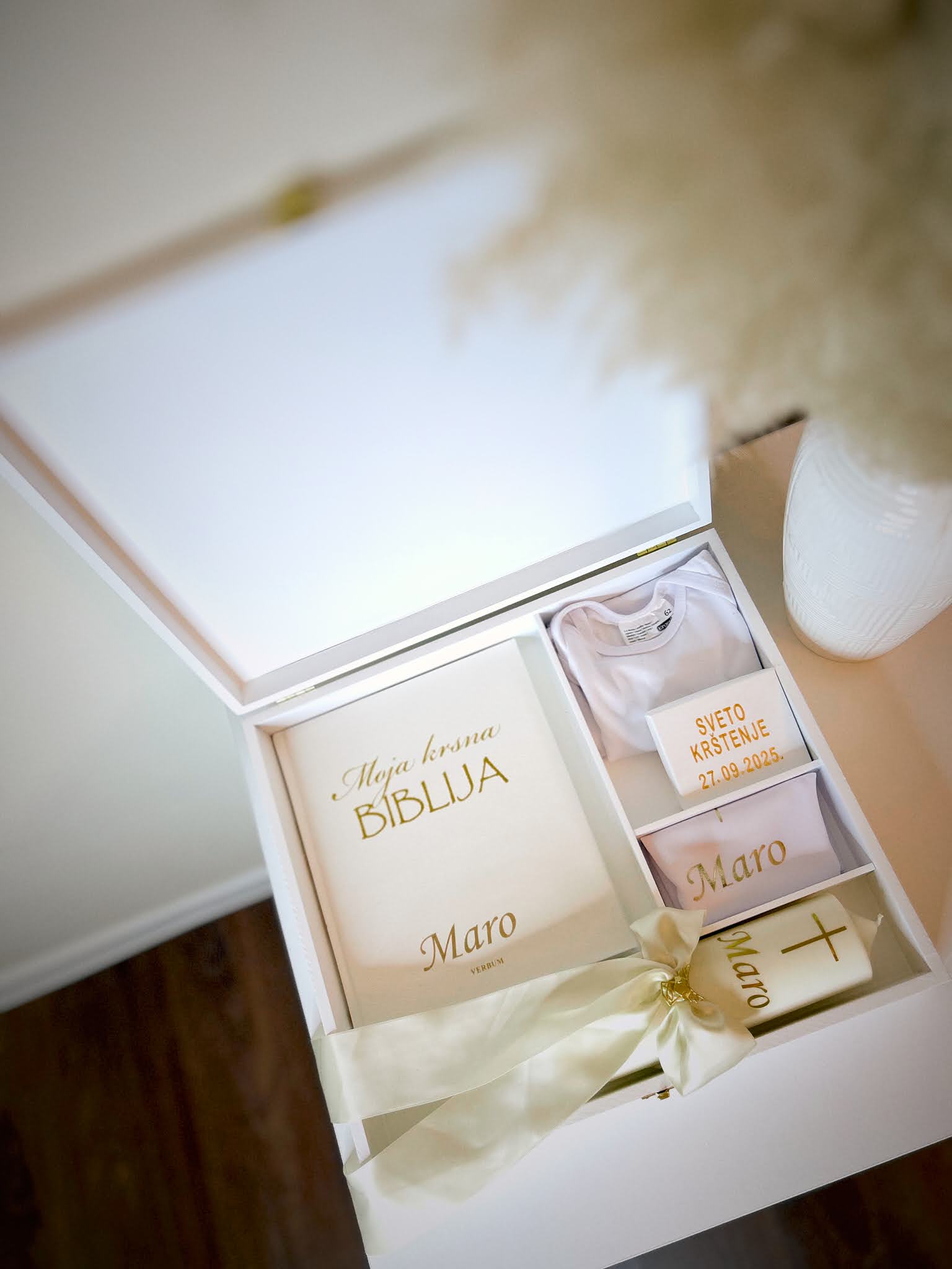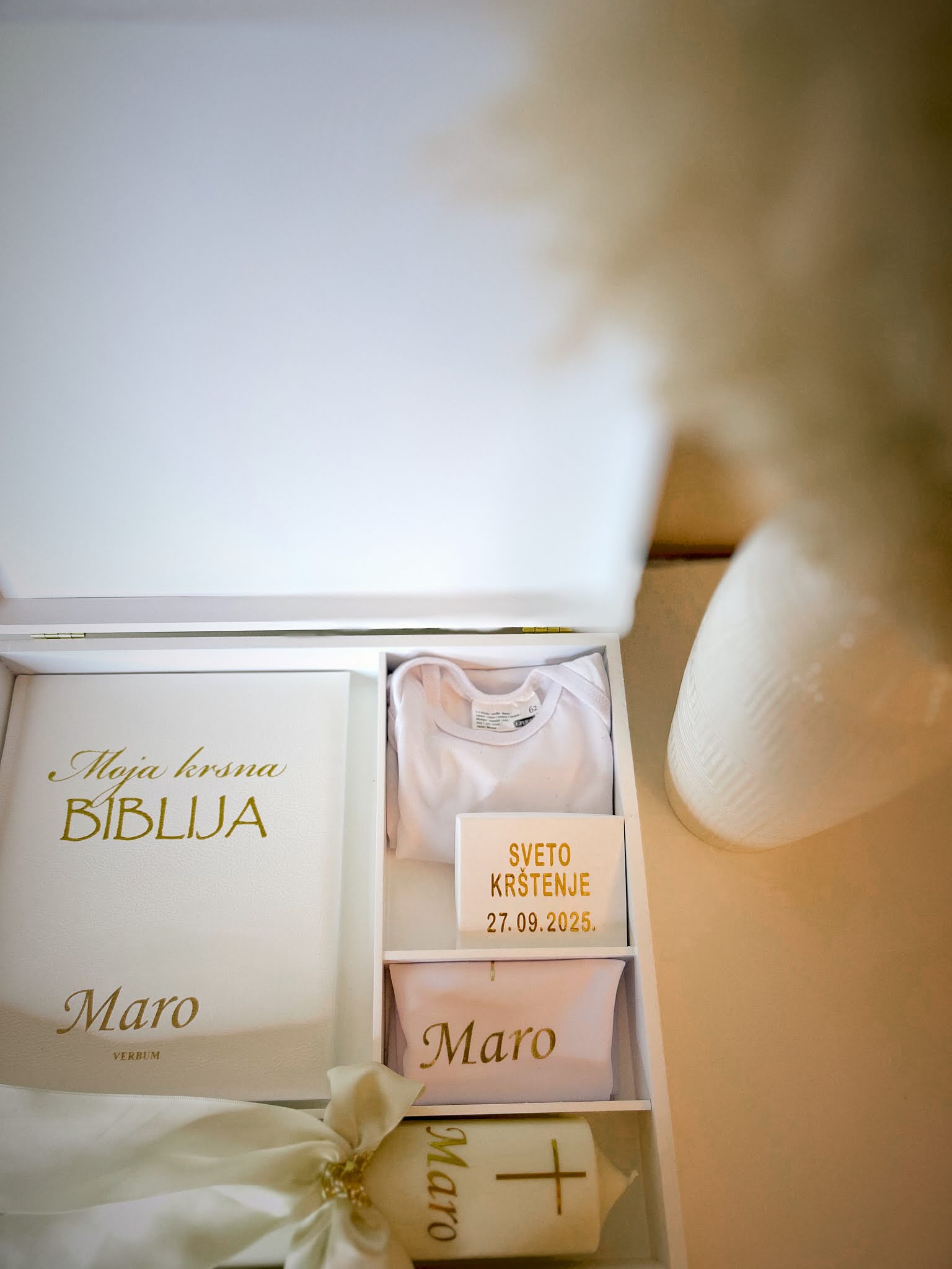 - Drvena personalizirana kutija, Biblija, svijeća, krunica, cipelice.