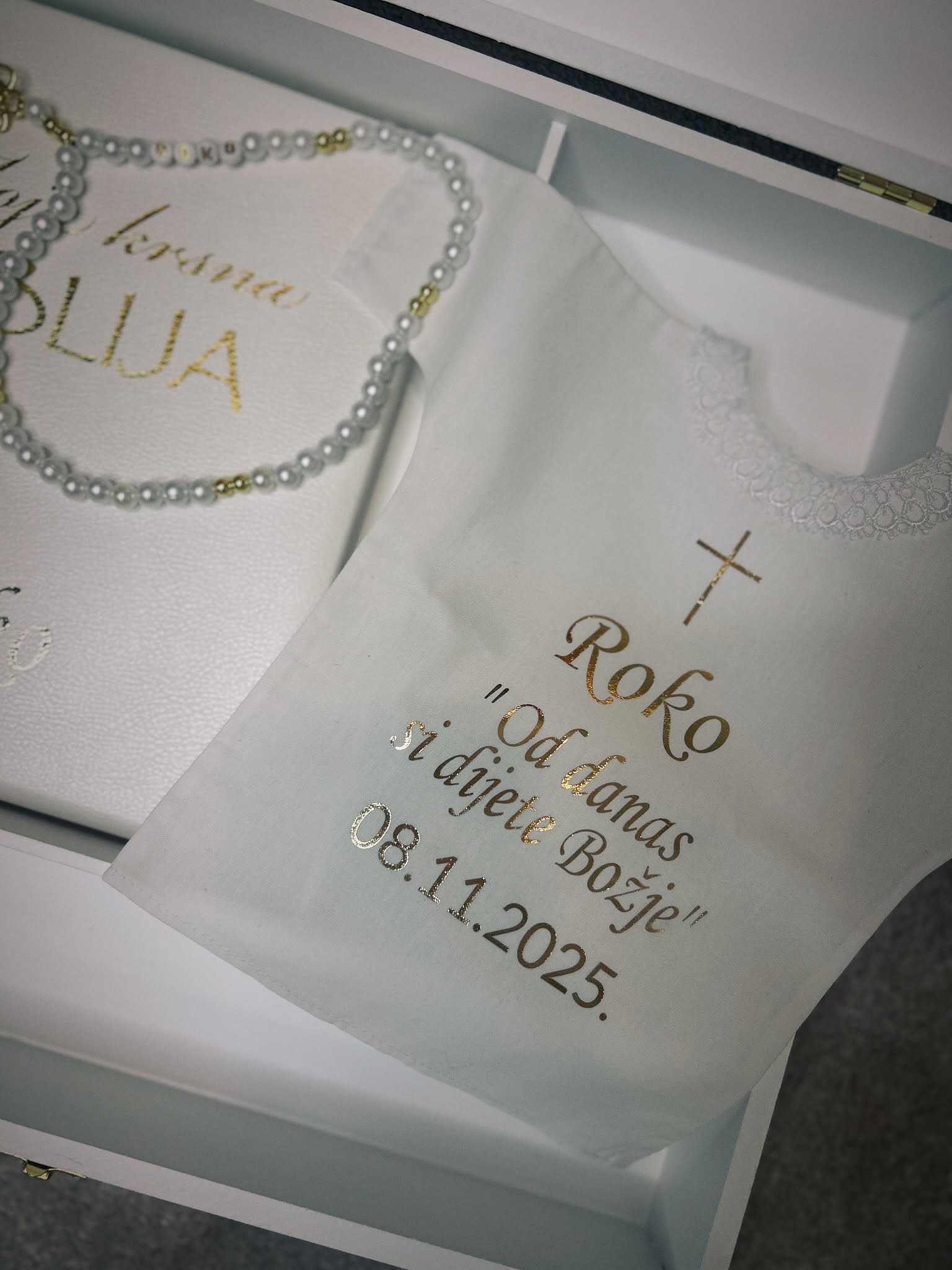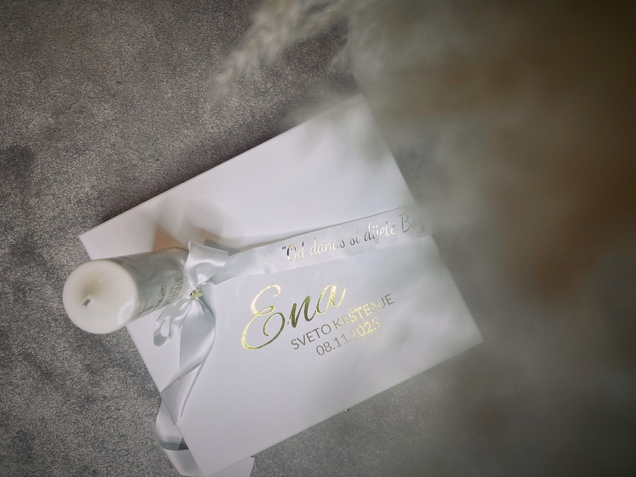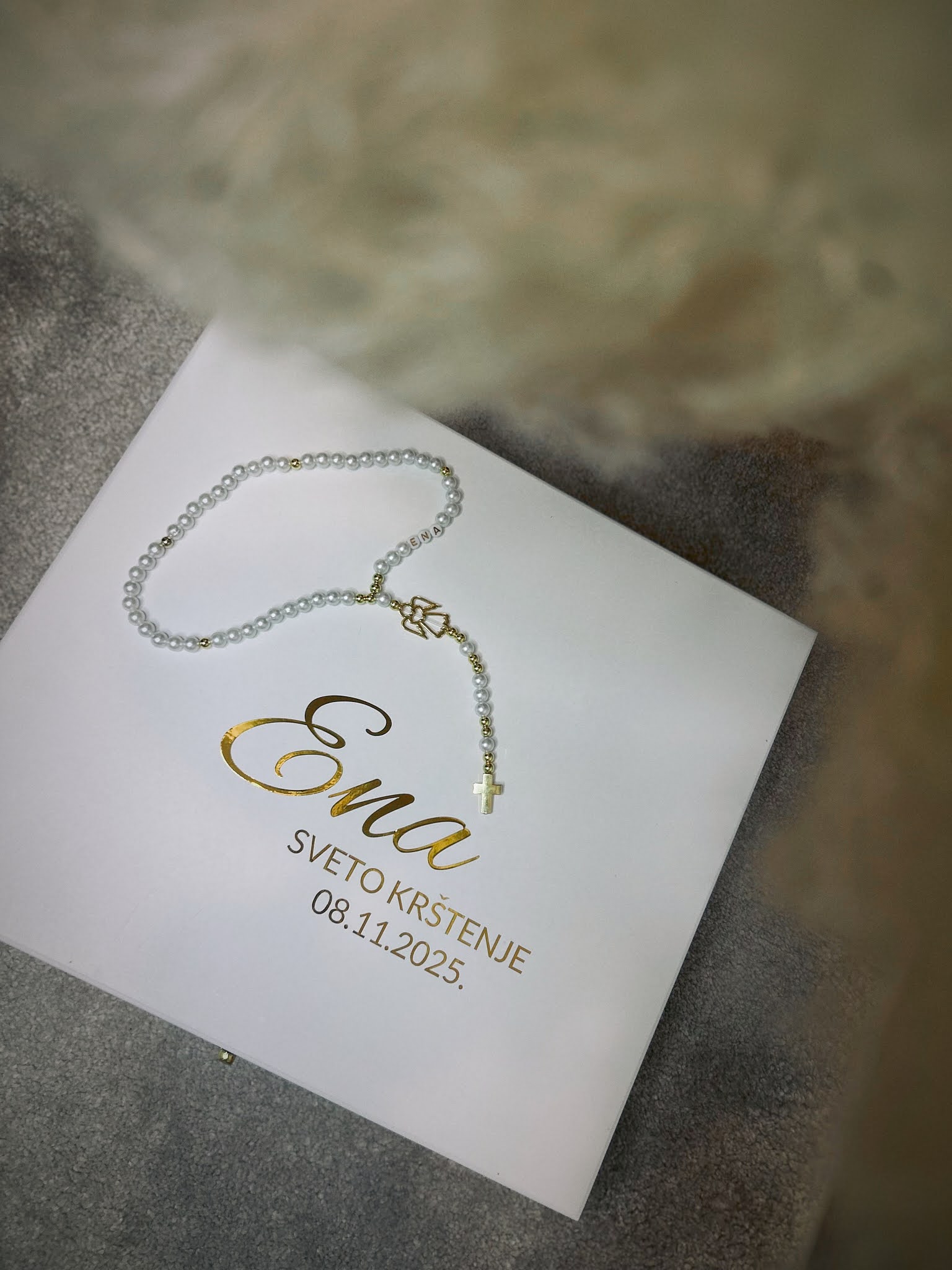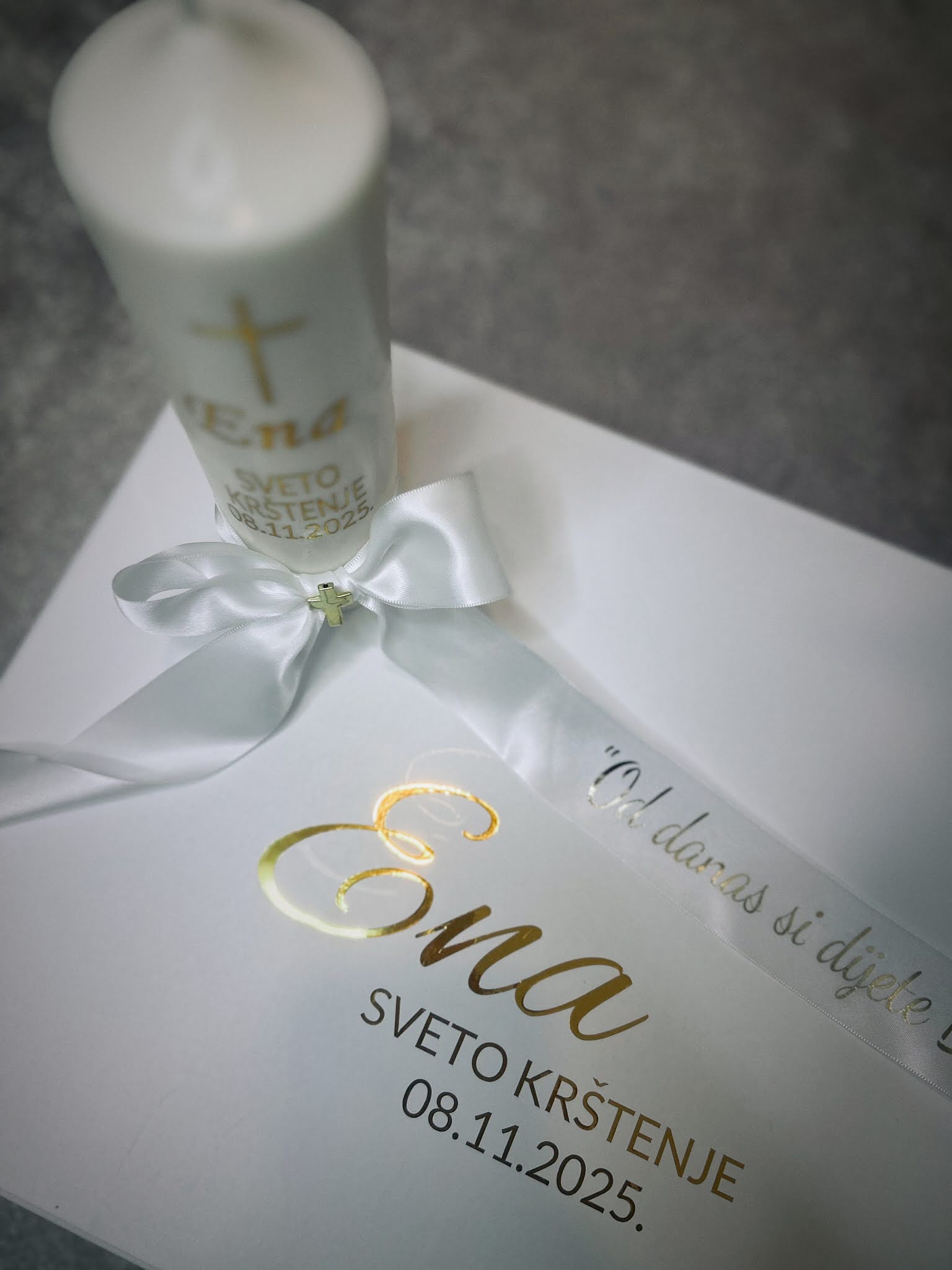 - Drvena personalizirana kutija, Biblija, svijeća, krunica, cipelice.