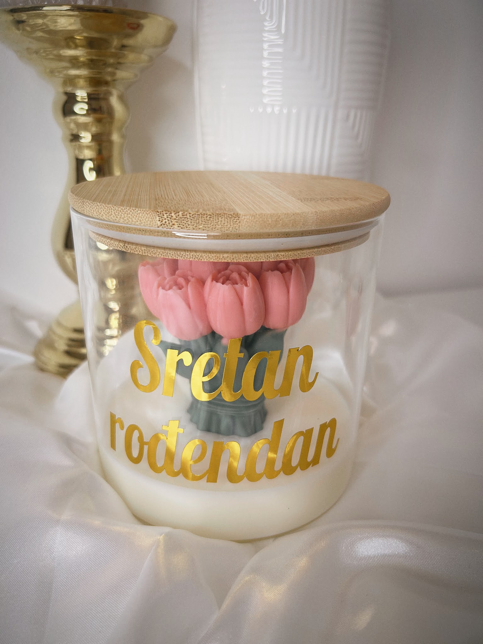 - Elegantna svijeća u visokoj staklenoj posudi s bambus poklopcem, ispunjena čistim sojinim voskom i ukrašena velikim buketom voštanih tulipana