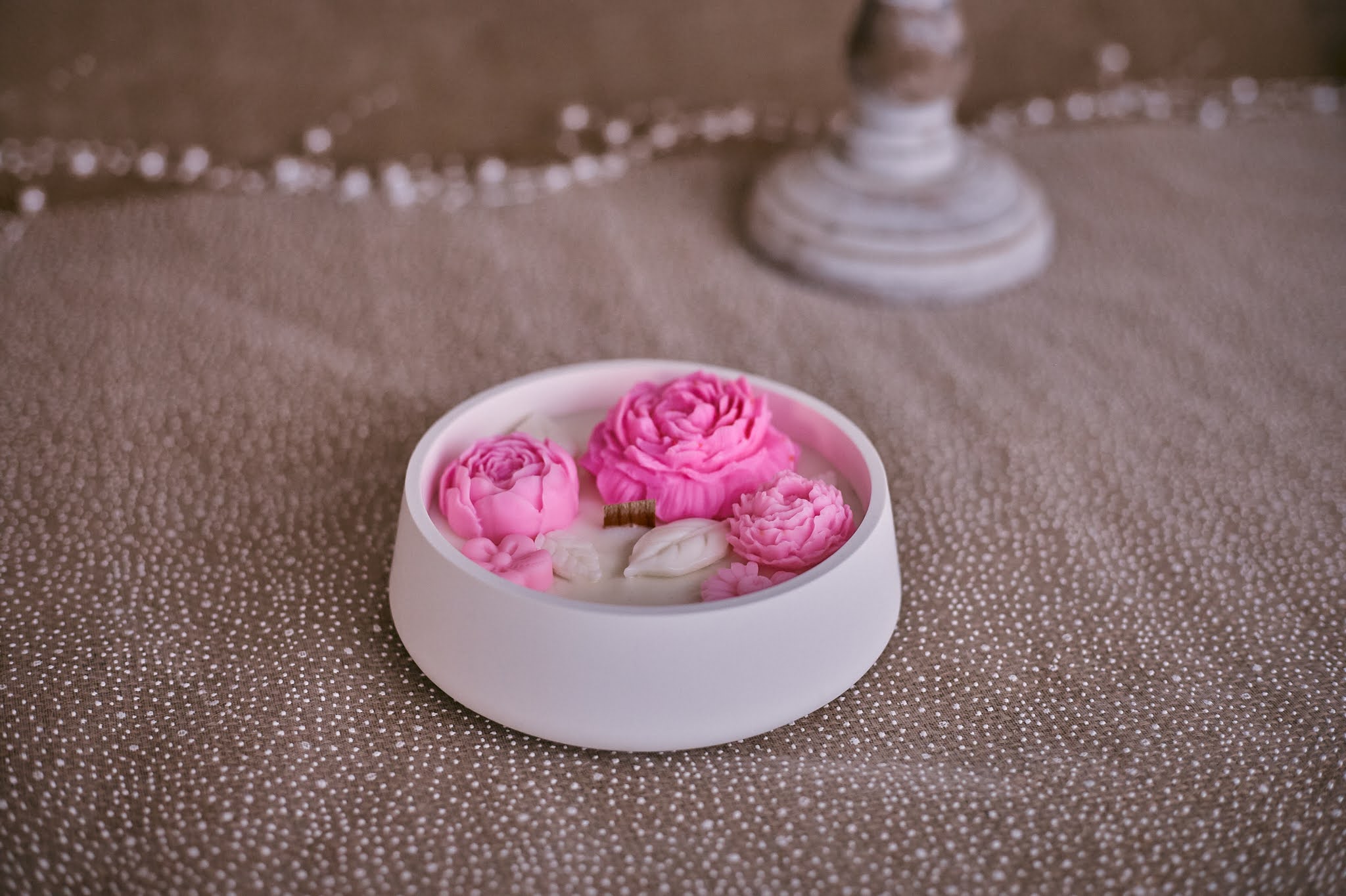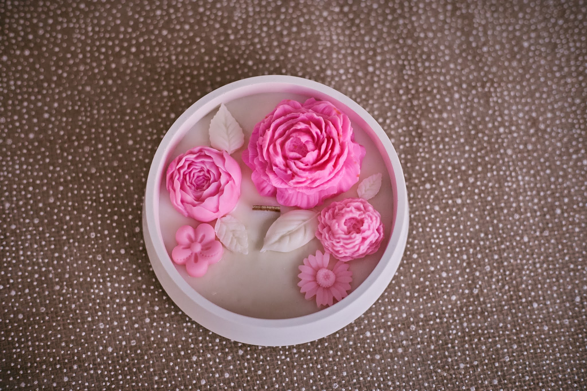 - U okrugloj gipsanoj posudici nalazi se sojin vosak, a na vrhu ručno oblikovani cvjetovi od voska koji svaku svijeću čine posebnom.