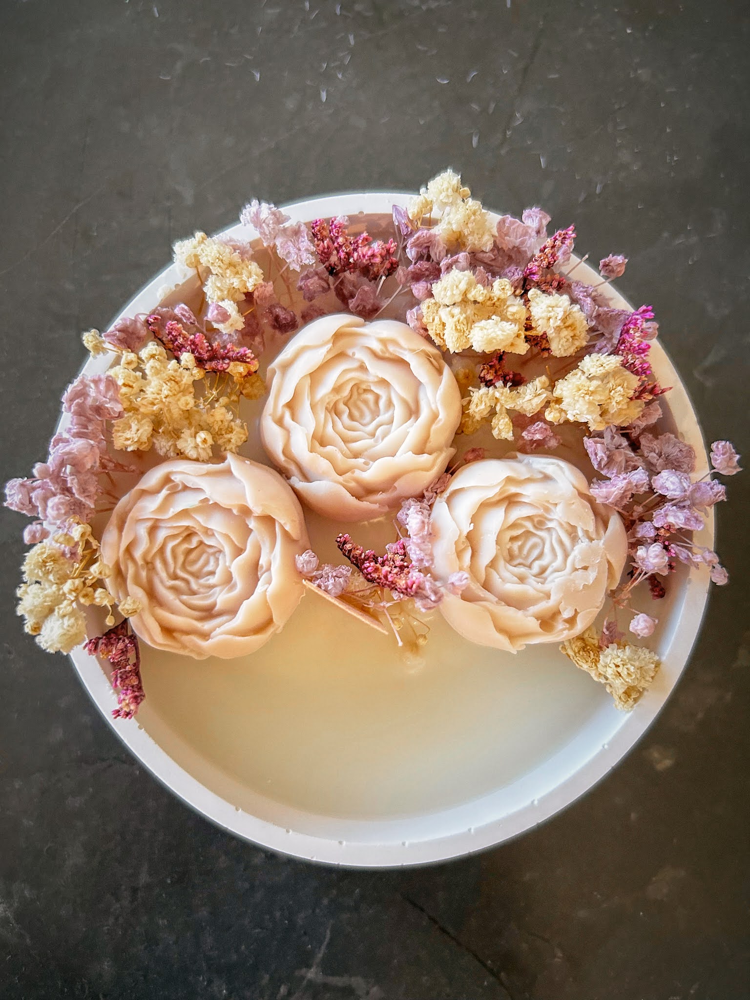 - Dekorativna svijeća u bijeloj gipsanoj zdjelici, ispunjena sojinim voskom i ukrašena trostrukim cvjetnim aranžmanom od voska i suhog cvijeća