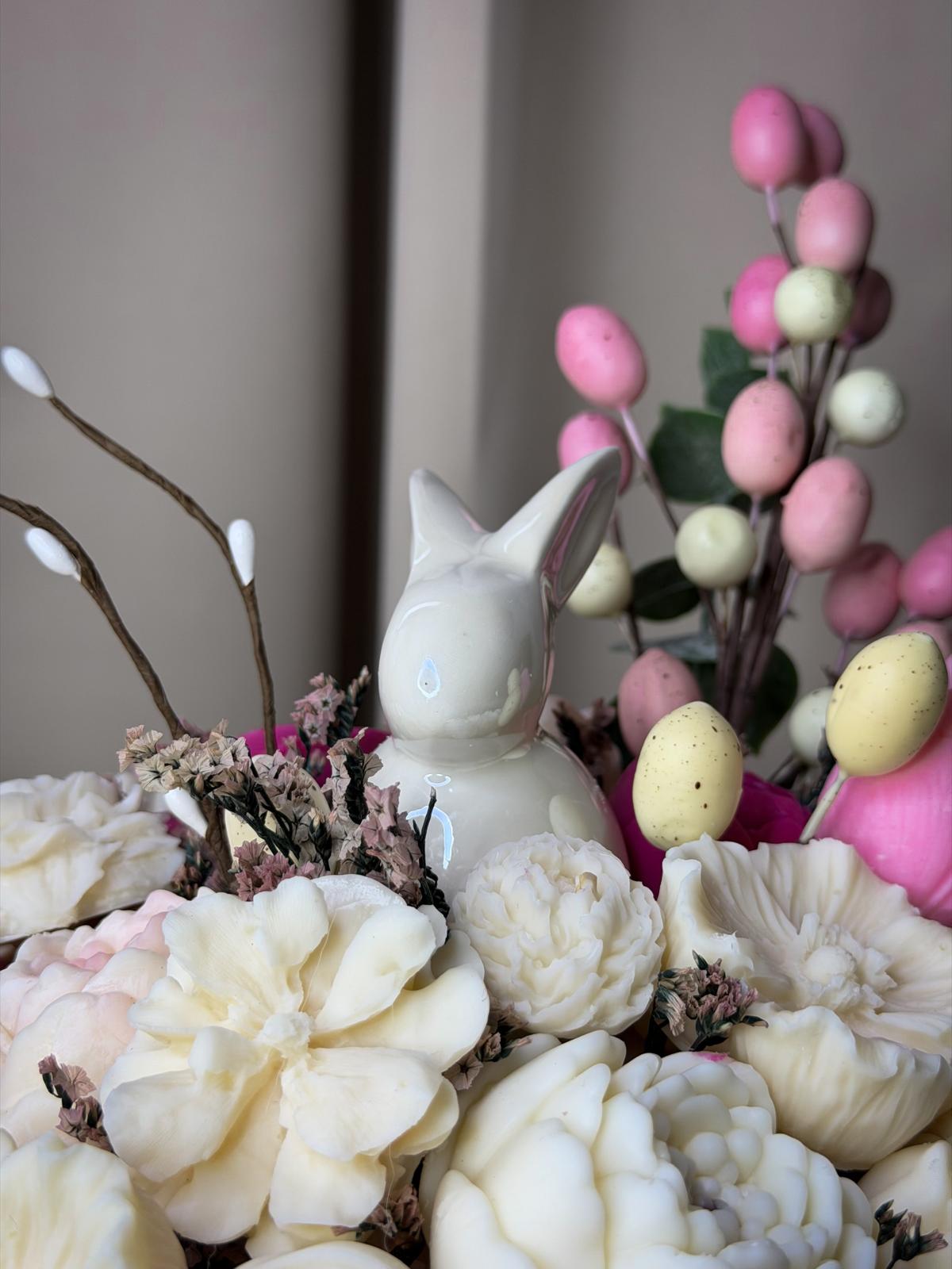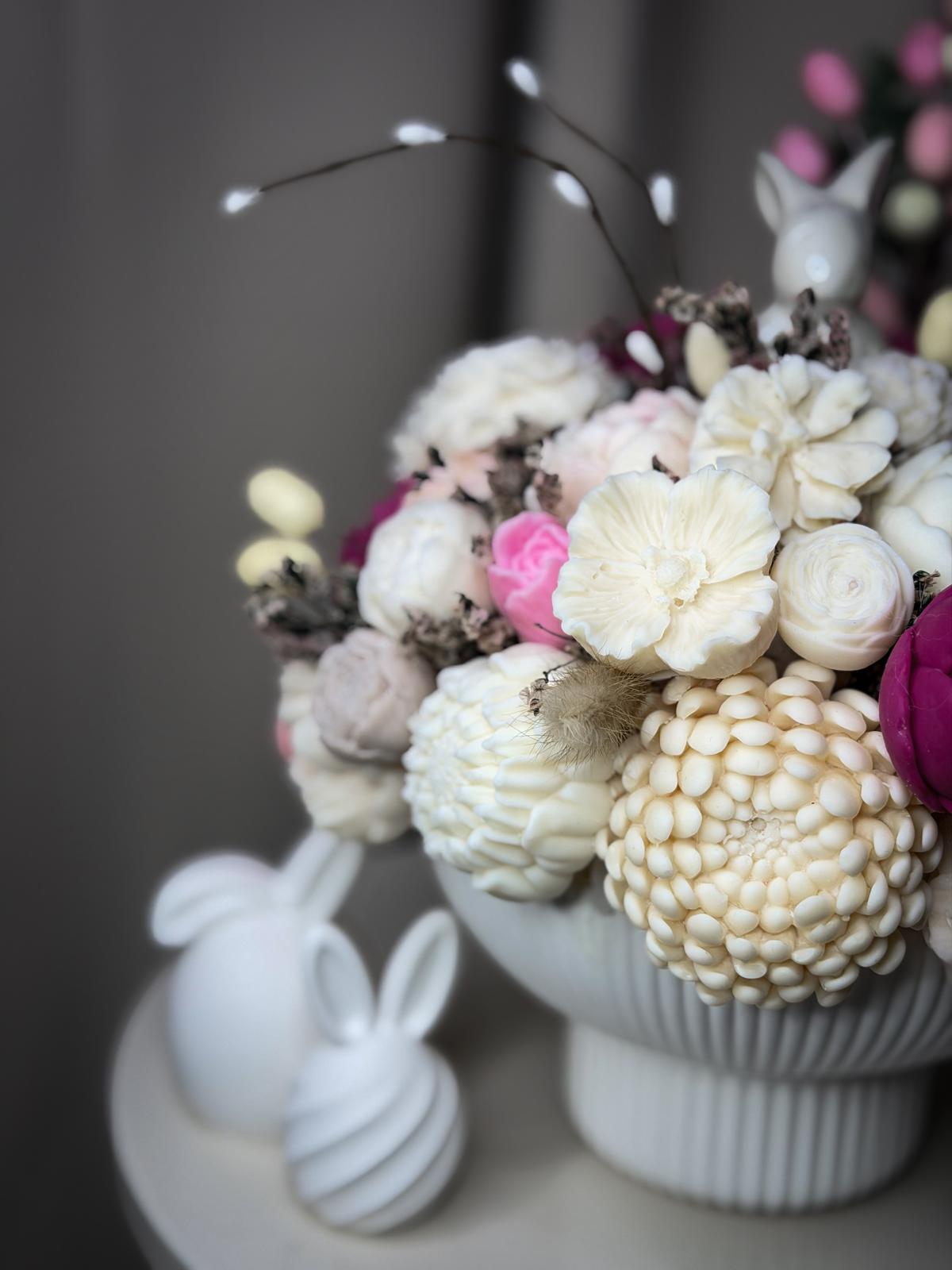 Ovaj unikatni dekorativni set spaja ručno izrađenu vazu od gipsa i cvjetne motive od prirodnog sojinog voska. Osmišljen je kao gotov ukras za uskrsni stol ili policu, a s obzirom na to da je svaki primjerak rad za sebe, kombinaciju boja možemo u potpunosti prilagoditi tvojim željama i interijeru.