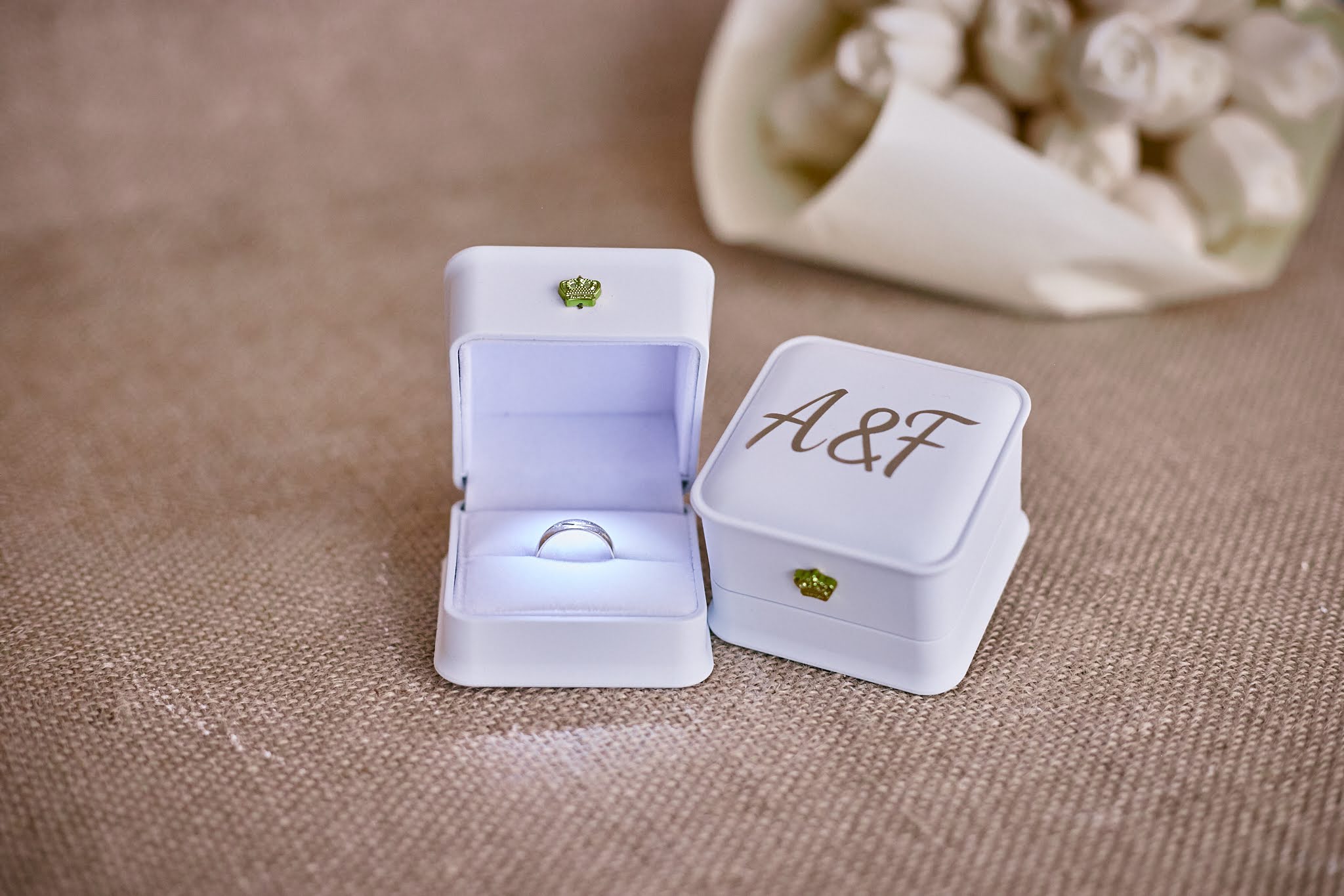 - Elegantna bijela kutijica za prstenje s personaliziranim inicijalima