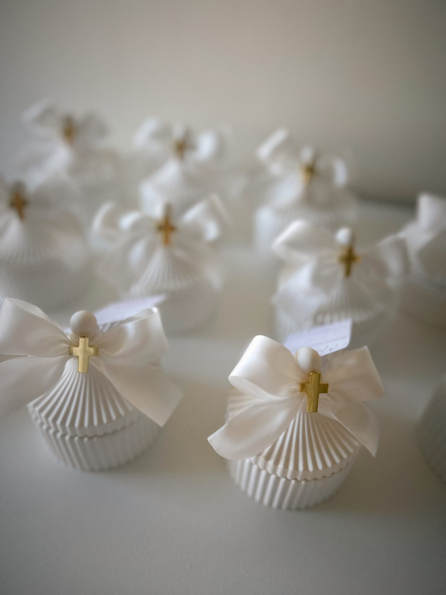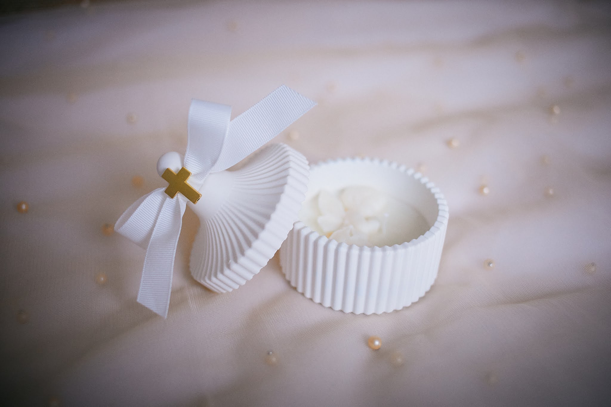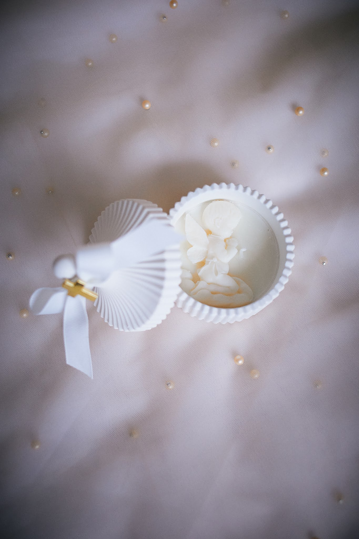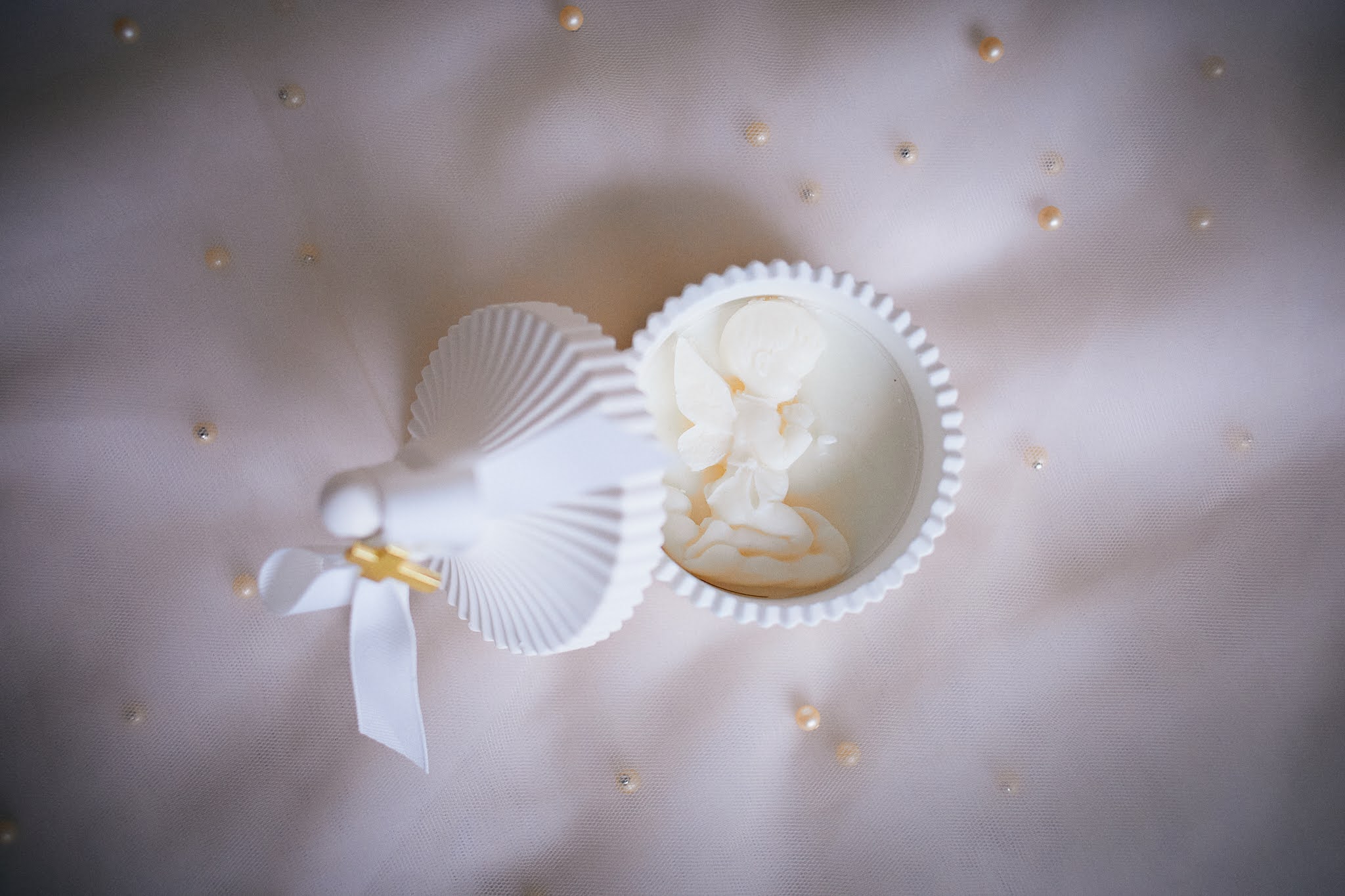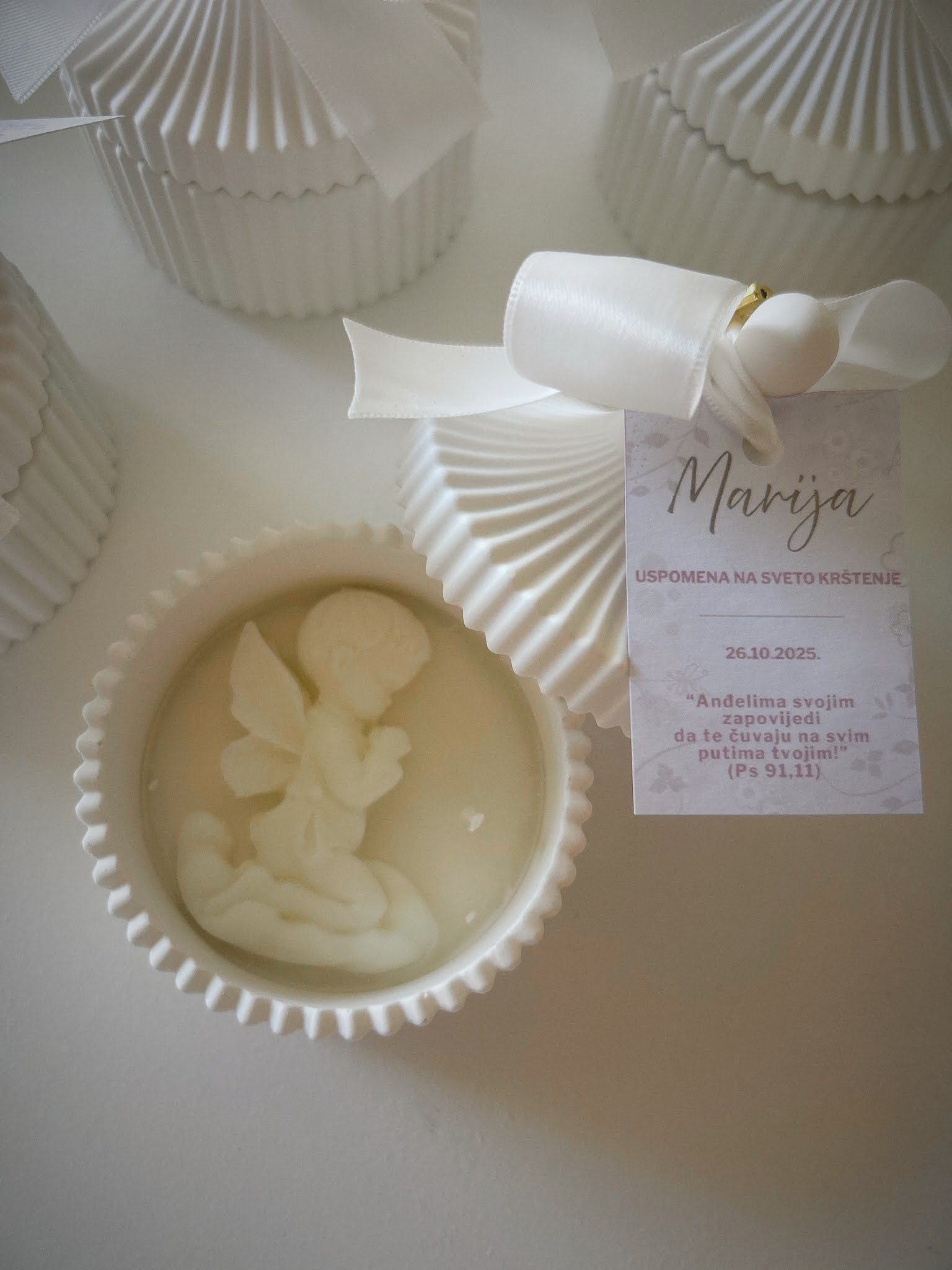 - Nježna svijeća s reljefnim anđelom, izlivena u dekorativnoj zdjelici