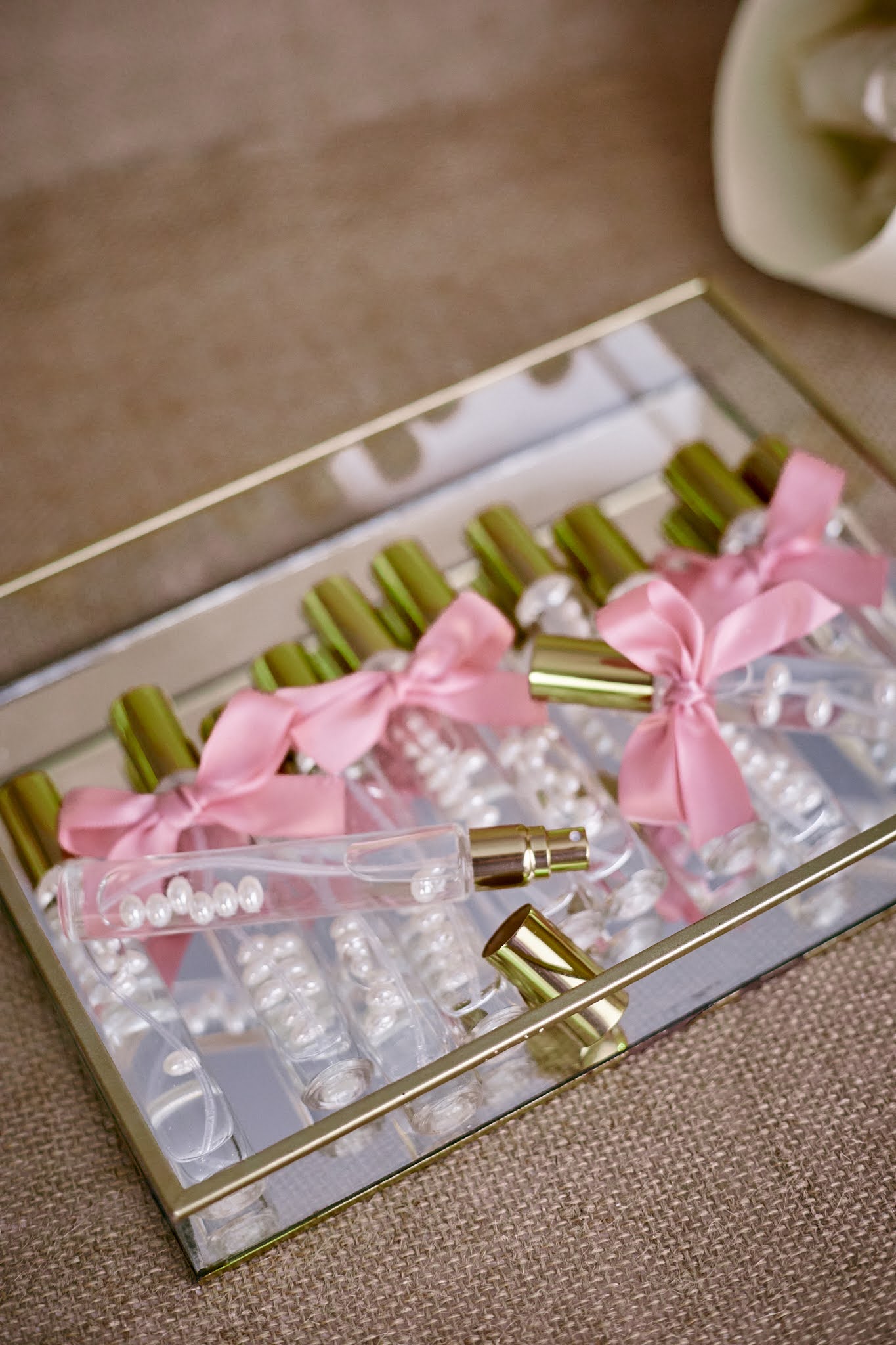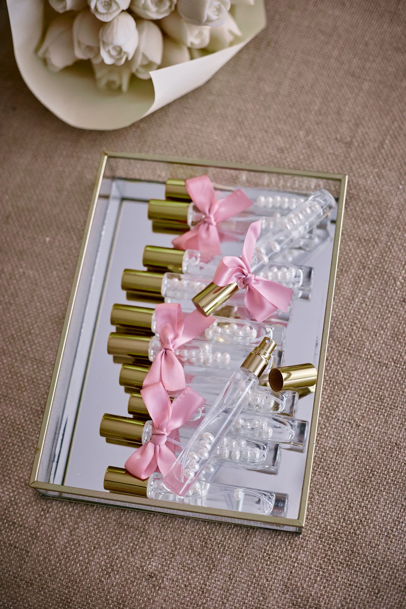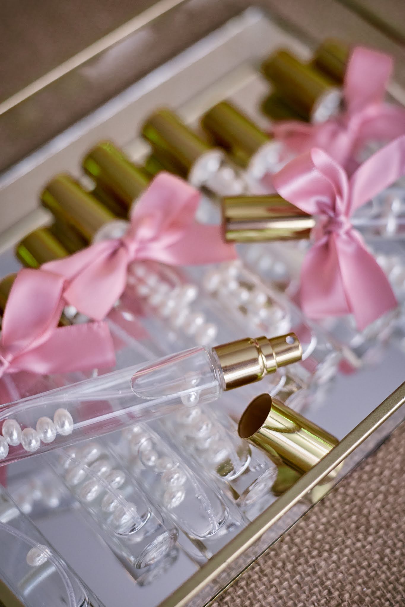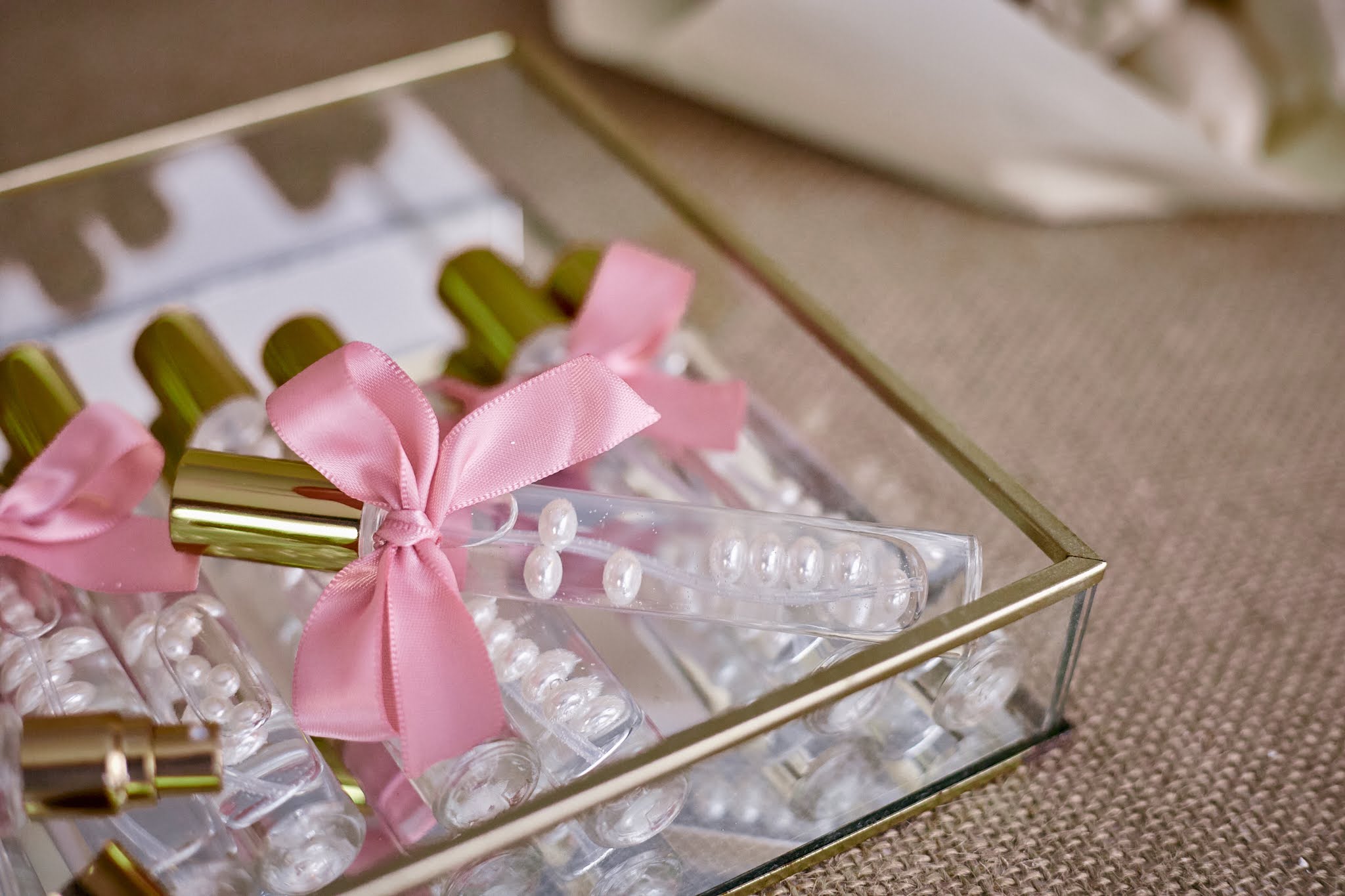 - Elegantna staklena bočica ispunjena bisernim perlicama i ukrašena mašnicom u nježnoj rozoj boji