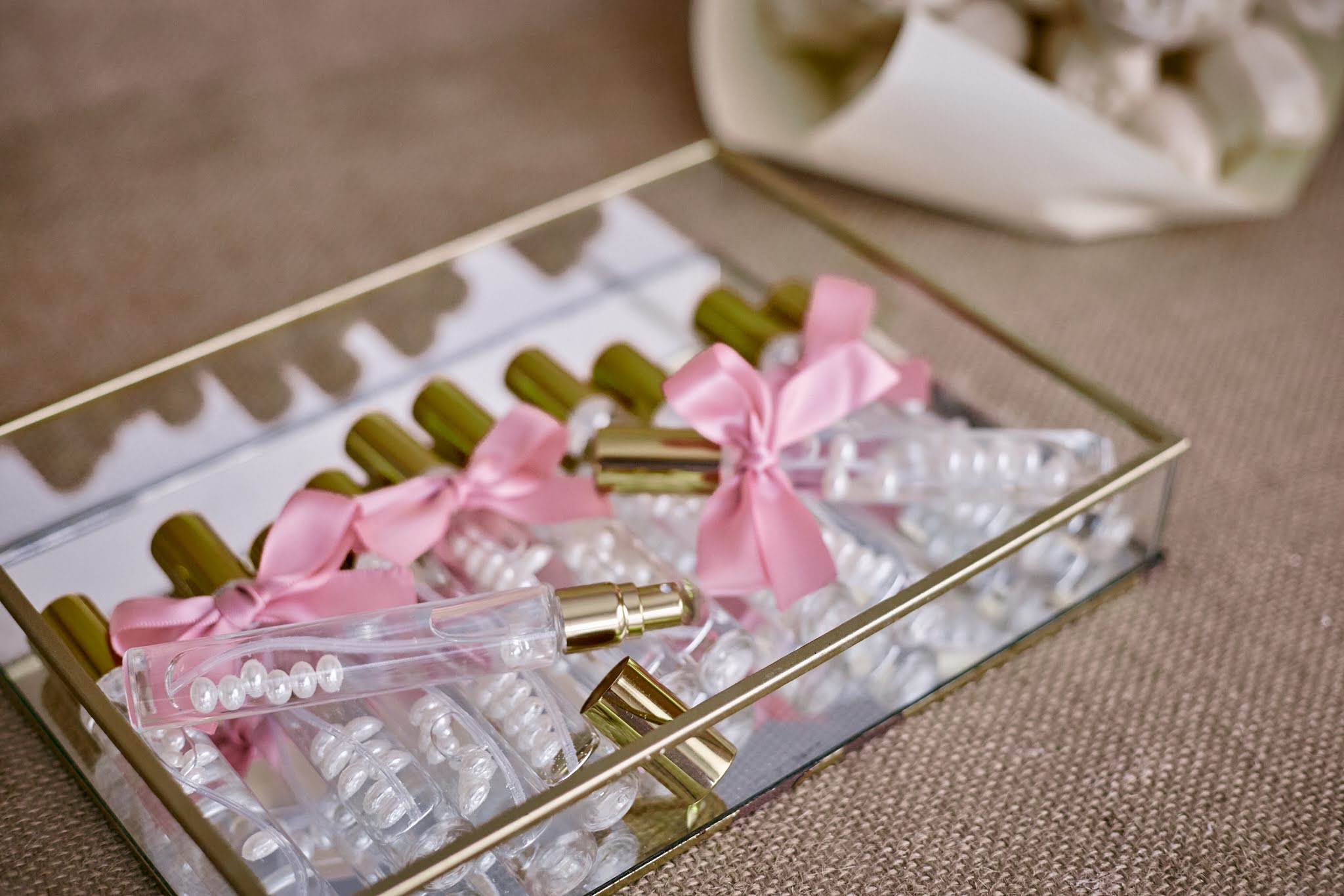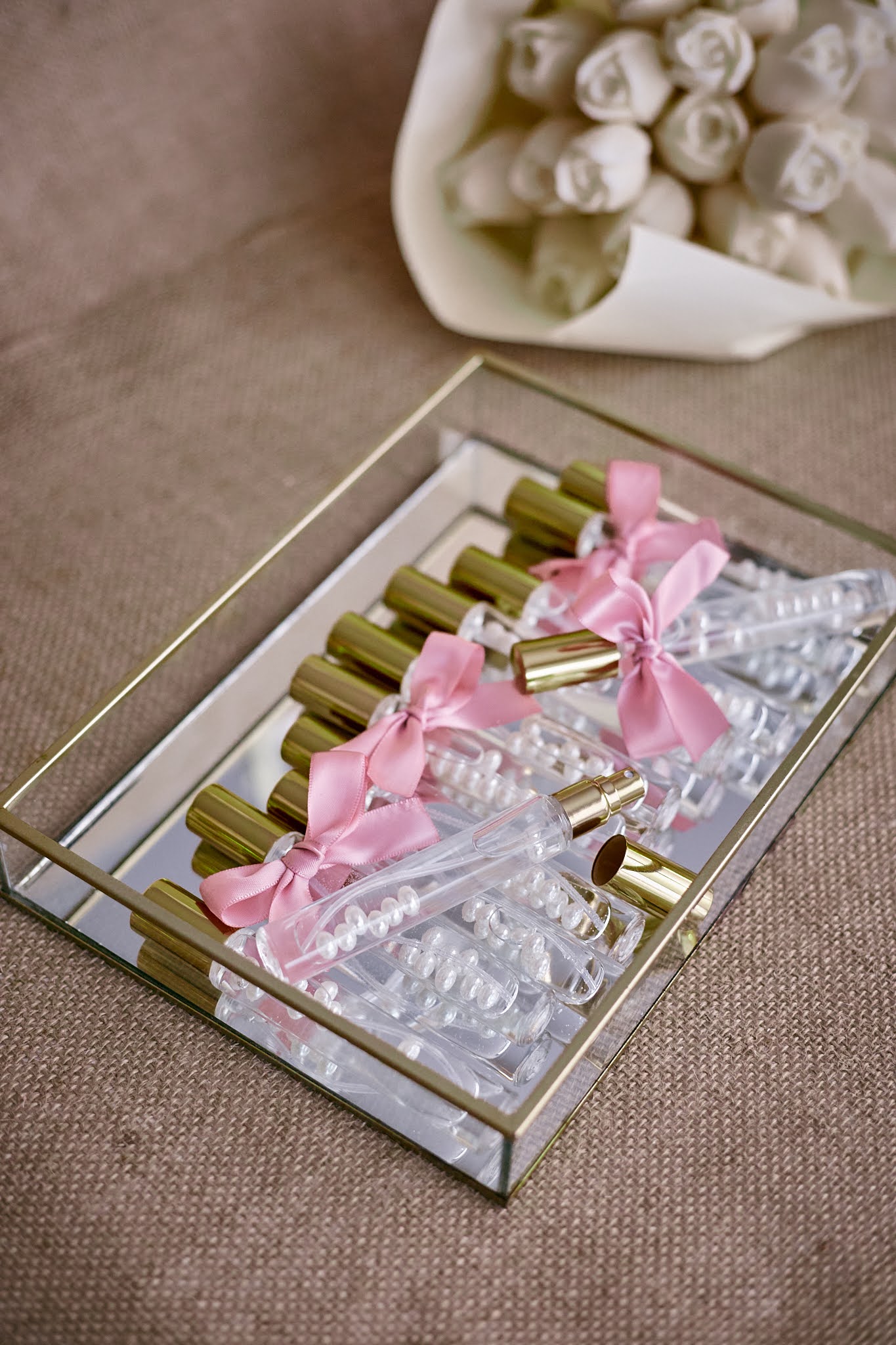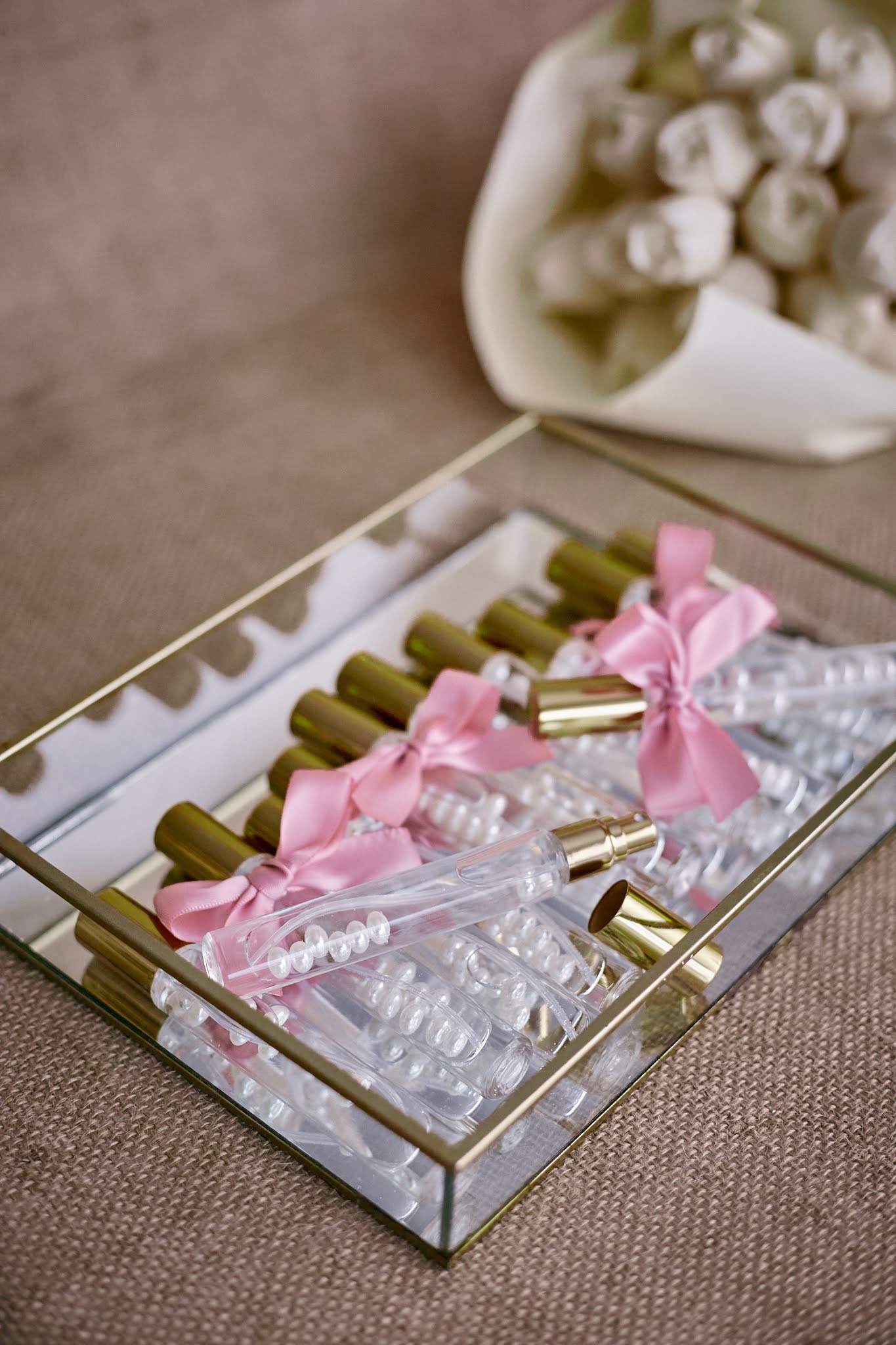 - Elegantna staklena bočica ispunjena bisernim perlicama i ukrašena mašnicom u nježnoj rozoj boji