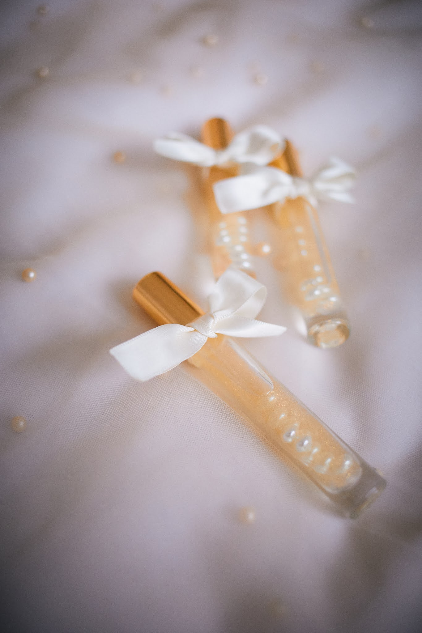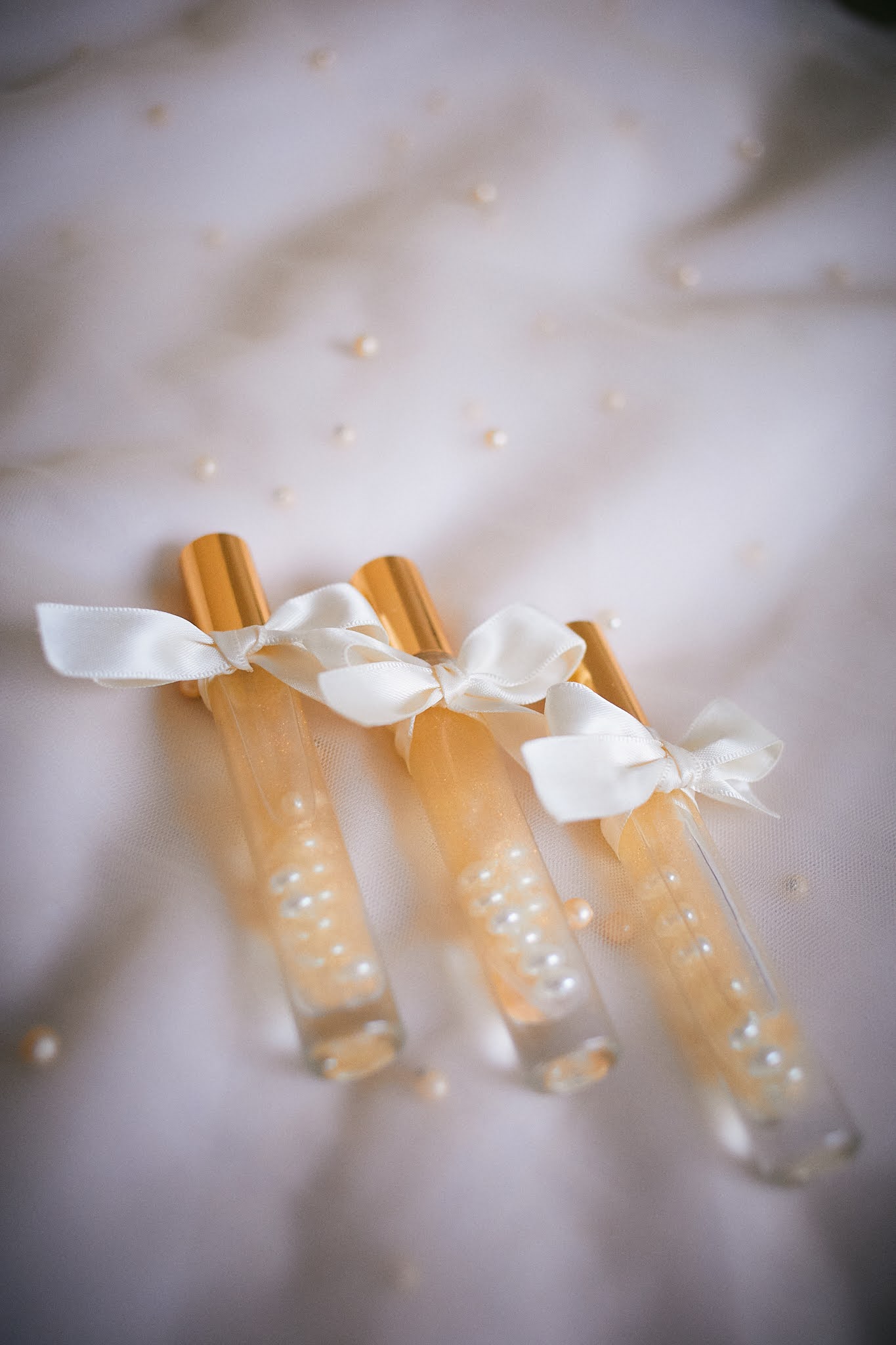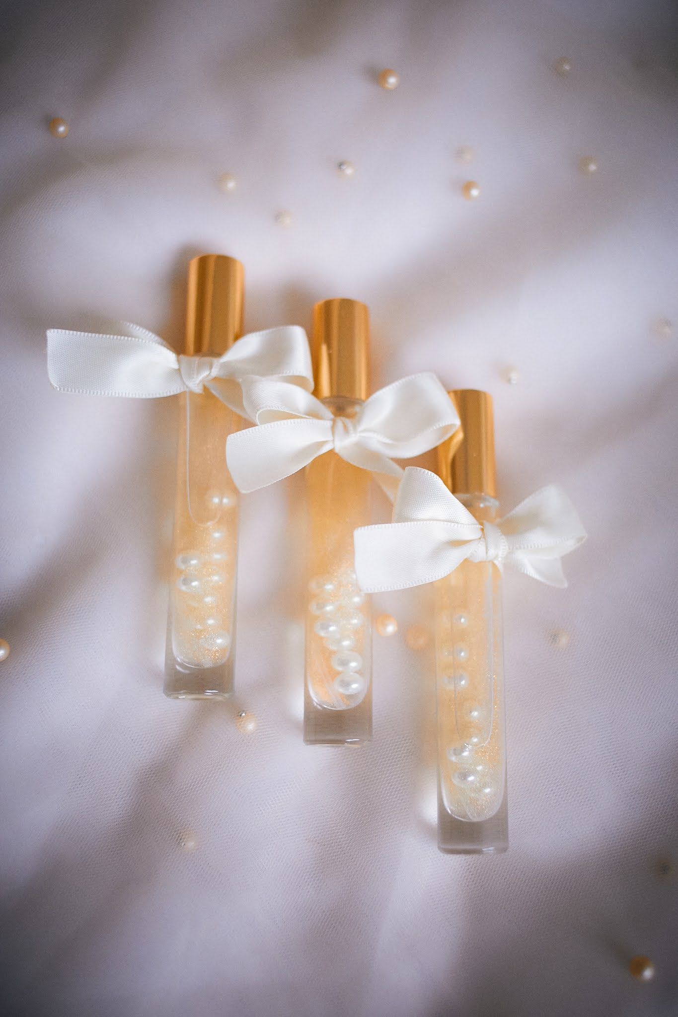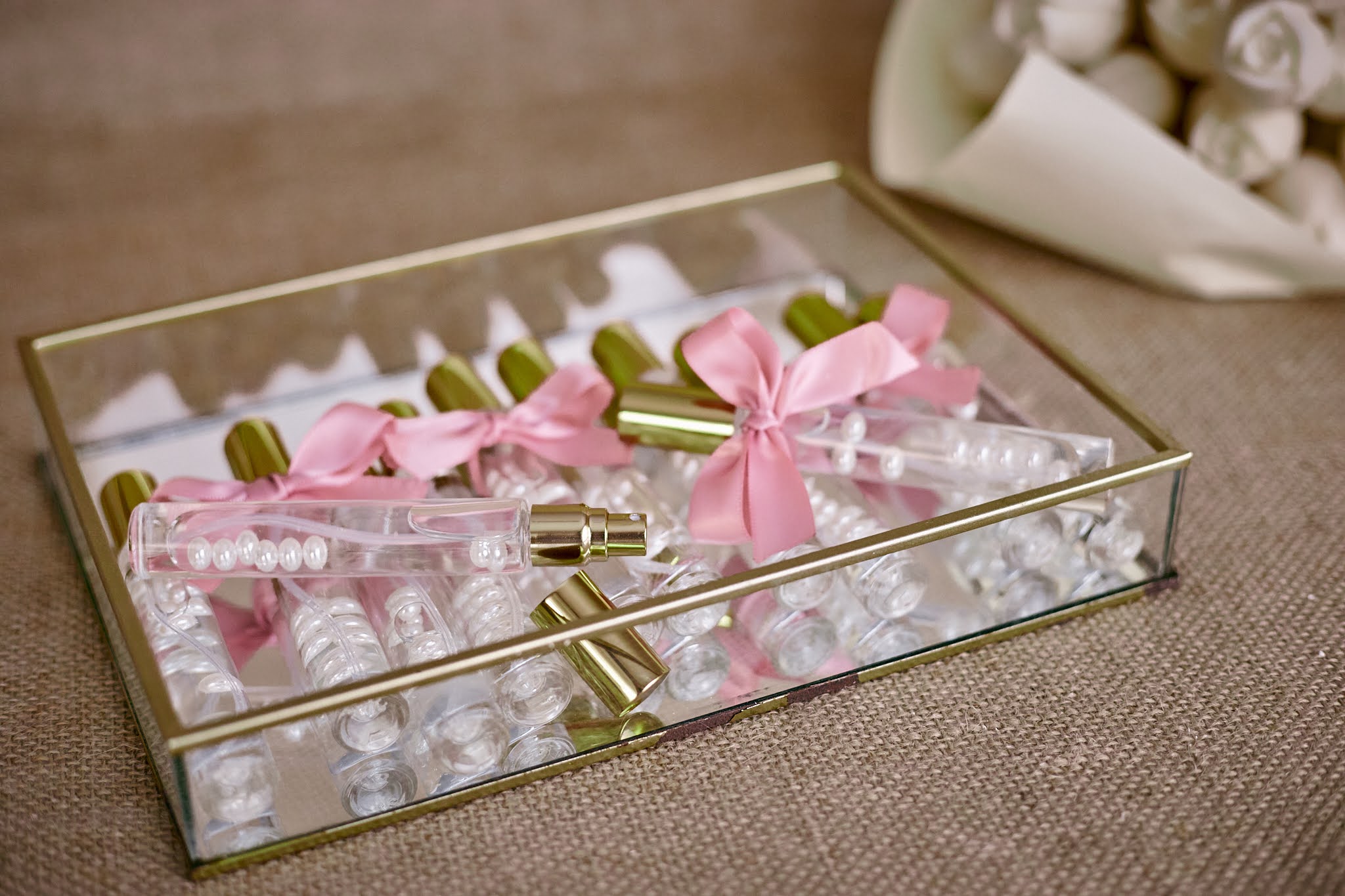 - Elegantna staklena bočica ispunjena bisernim perlicama i ukrašena mašnicom u nježnoj rozoj boji